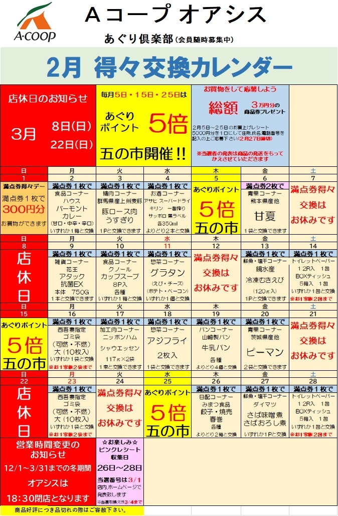 5,000円、3,000円、500円のAコープ商品券とお引き換えいたします。